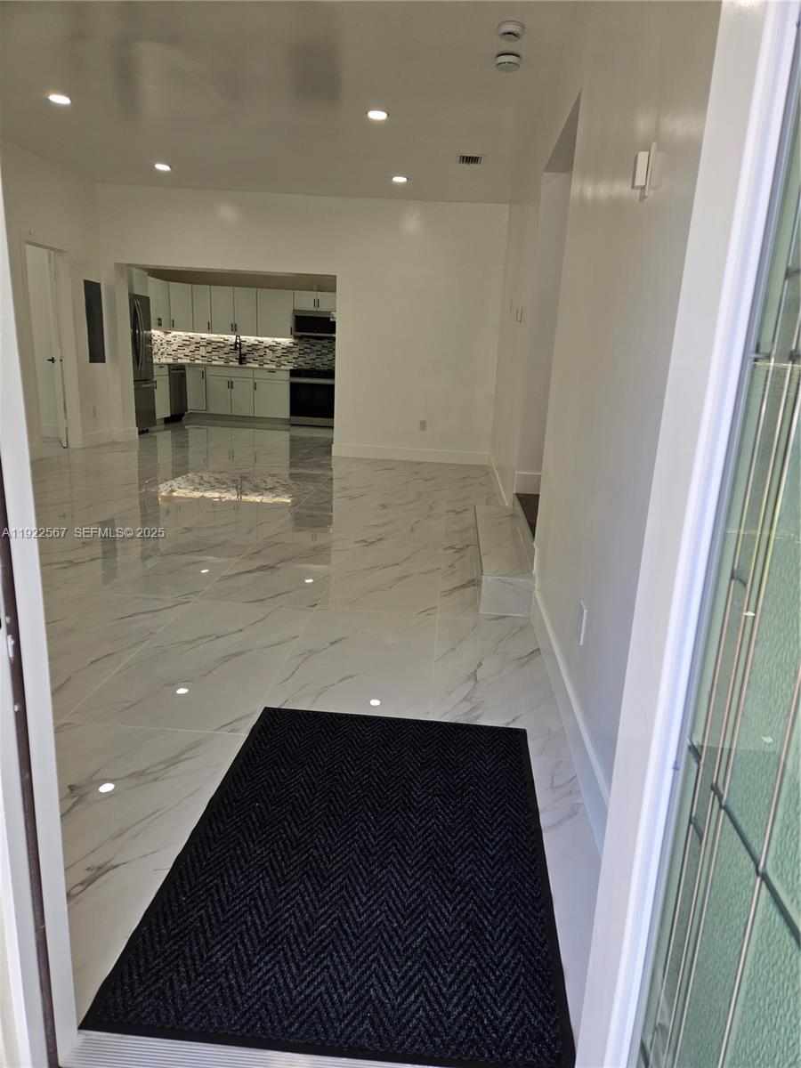 BH Fully renovated and never previously occupied since completion, this spacious front residence offers exceptional value for its size and layout. The home features 5 large bedrooms and 3 full bathrooms, generous living and dining areas, and a modern open kitchen with quartz countertops, stone/glass backsplash, undermount sink, and stainless-steel appliances including dishwasher, microwave, full-size stove with oven, and refrigerator. Additional features include indoor laundry with washer and dryer, recessed LED lighting, 24" x 48" porcelain tile flooring, impact windows and doors, tankless water heater, security system, and exterior lighting. Enjoy use of a large outdoor area with fenced in-ground pool, deck, playground area with rubber-mulch surface, and space for outdoor entertaining. A rare opportunity to lease a 5-bedroom residence at an exceptional value, offering space, privacy, and modern finishes rarely found in the area.