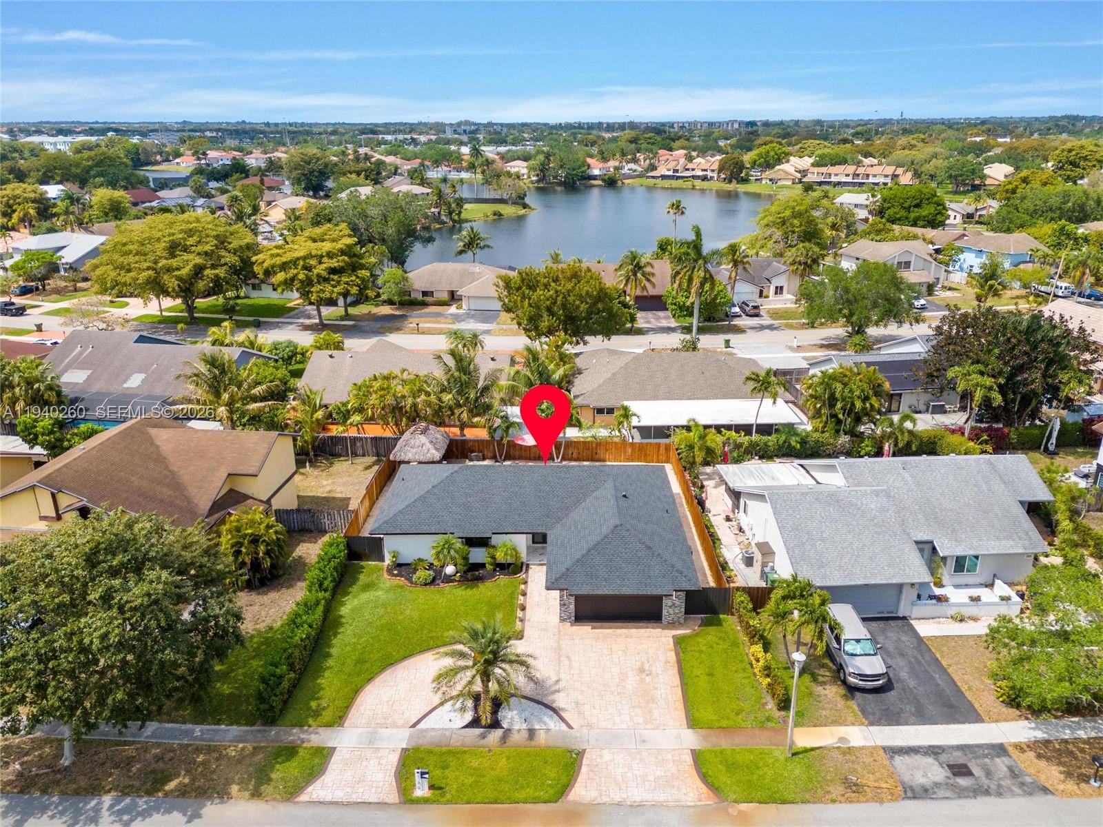 Welcome to your year-round summer retreat. This tastefully remodeled home features a bright open-concept layout, perfect for family gatherings and entertaining. It offers 3 spacious bedrooms and 2 full bathrooms, designed for comfort and functionality. Step outside to a magnificent resurfaced pool with a water heater, ideal for enjoying Florida living all year long. Relax or entertain at the beautiful tiki bar, complete with furniture and fans, creating a true tropical oasis. Additional highlights include a circular driveway, double-car garage, impact windows and doors, new roof, and fresh interior and exterior paint. Fast approval NO HOA Prime location — location, location, location! Welcome home!!!