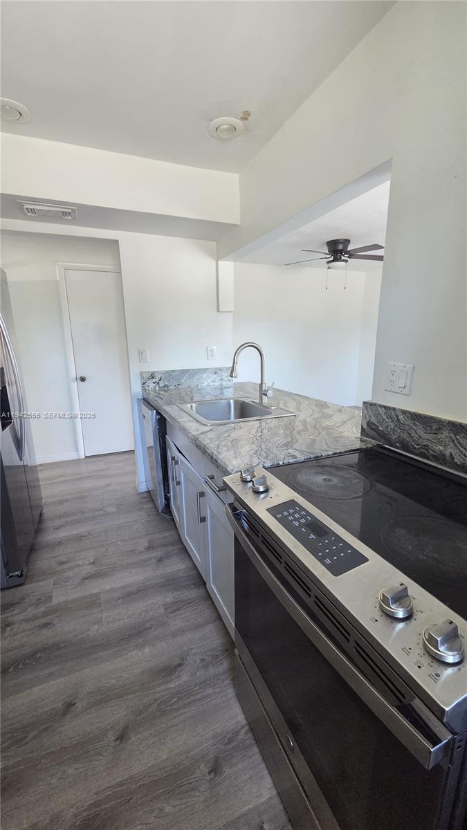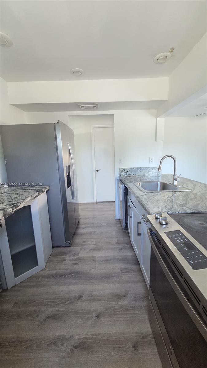 MOVE-IN READY! Beautifully updated 3-bedroom condo in a quiet Cutler Bay neighborhood. This bright and modern residence features laminate flooring throughout and a fully renovated kitchen with Calacatta-style granite countertops, matching backsplash, and stainless-steel appliances. Washer and dryer inside the unit. The bathroom has been completely updated with Calacatta-style porcelain flooring and walls, a modern walk-in shower, and contemporary finishes. Recessed lighting and clean, neutral tones create an open and inviting feel throughout. Spacious and functional layout ideal for long-term tenancy. Conveniently located near major roads, schools, shopping, and dining. Available for immediate occupancy.
