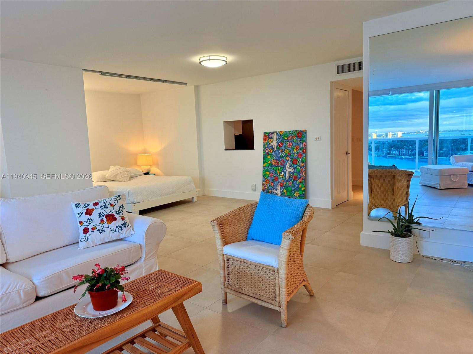 Furnished Waterfront Studio (993 SF) on the 14th floor with floor-to-ceiling high-impact sliding windows and dynamic Intracoastal, Biscayne Bay, and skyline views. Rare 26-ft private balcony exclusive to this line. Features stainless steel appliances: fridge, stove, microwave, dishwasher, black granite countertops, modern bath, walk-in closet, linen closet, and dedicated adjacent storage room. Building offers 24/7 security, valet parking , fully equipped gym, sauna, on-site management, and laundry steps away. Pool under renovation. Two blocks from beach and boardwalk with easy access to South Beach, Bal Harbour, Wynwood, Design District, and MIA. $2,500/month. Sorry No pets. Available 3/1/26.
