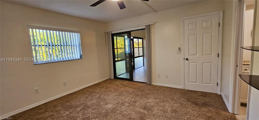 This beautifully updated 2-bedroom, 2-bathroom first-floor condo has it all. Situated in one of Cape Coral’s most desirable and meticulously maintained communities, you’re just steps from everything—banks, Publix, Lobster Lady, shopping, restaurants, medical offices, and more. You truly don’t even need a car here. Enjoy a resort-style pool and lounge area, plus the convenience of your own covered parking space directly in front of your unit. Inside, the home features hurricane-impact sliding doors, tile flooring and carpet in the bedrooms and part of living room and a spacious open kitchen equipped with white appliances, granite countertops, white cabinetry, tray ceiling, and a stylish backsplash. Private laundry inside the condo—The living room boasts a brand-new remote-control ceiling fan, while the master suite offers its own set of hurricane sliders that lead to a large, covered, and screened-in lanai overlooking a peaceful garden setting. The master bedroom also includes a huge walk-in closet with custom wood shelving. The master bathroom is stunning featuring granite countertop, LED recessed lighting, and a beautiful walk-in shower with handheld spray. The guest bedroom is generously sized with a large closet and new fan, and the guest bathroom offers a tub/shower combination with a granite-topped vanity. Fresh paint throughout makes the entire condo feel crisp and inviting.