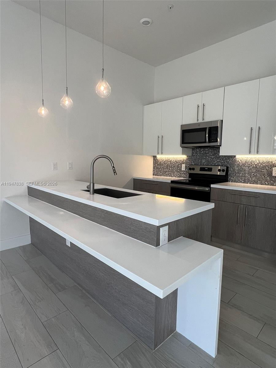 This beautiful 2-story townhouse is located in the desirable gated community of Strata at Plantation. High ceilings and an open floor plan create a bright and elegant atmosphere throughout the unit. The kitchen with sleek European cabinetry, stainless steel appliances, and a signature island is perfect. Designer bathrooms and contemporary finishes add a luxurious touch, while ceramic tile on the main level and plush carpeting upstairs. The primary suite features a spa-like bathroom, a large closet, and a private balcony. The 2 bedrooms are filled with natural light and have a lake. Sliding glass doors from the living room open to a common garden area, ideal for outdoors activities. Close to the unit, the clubhouse provides residents with a range of amenities, including a pool and fitness center.