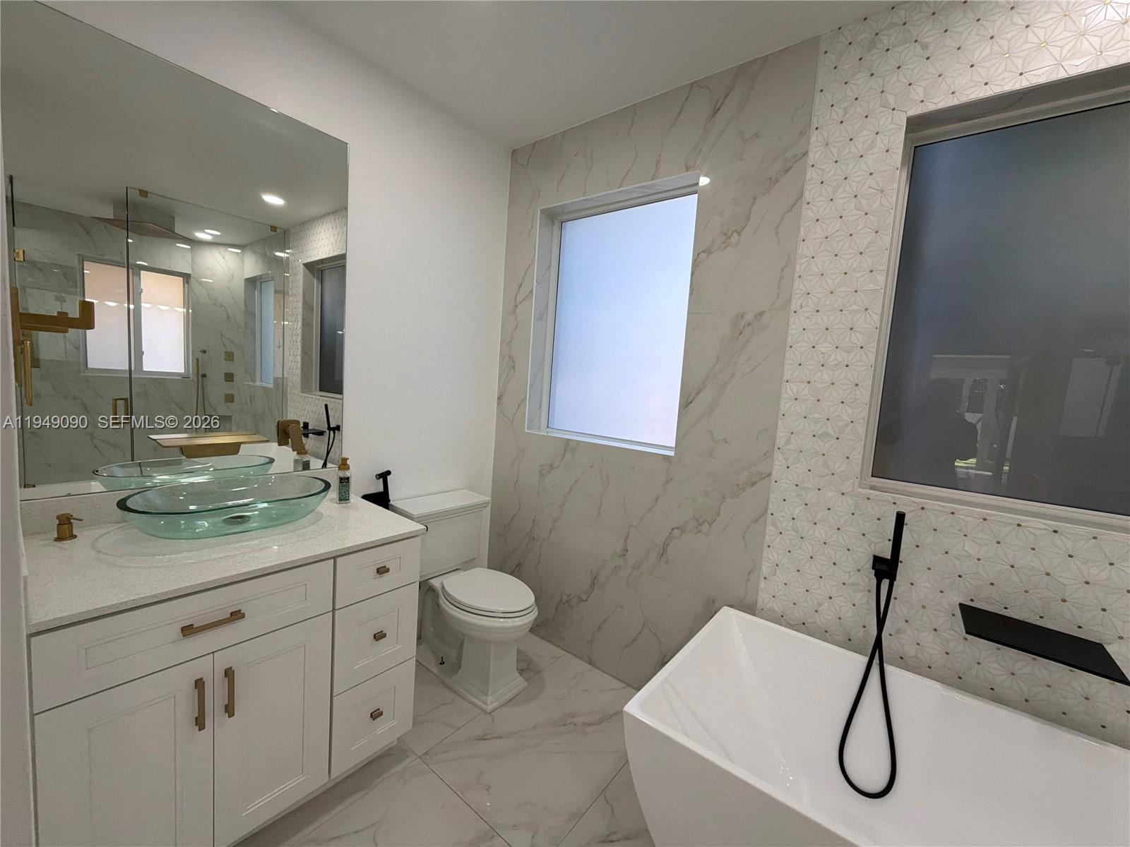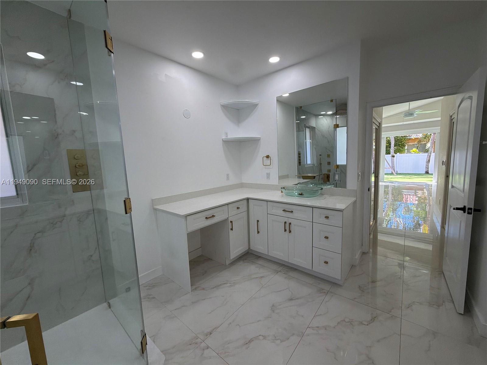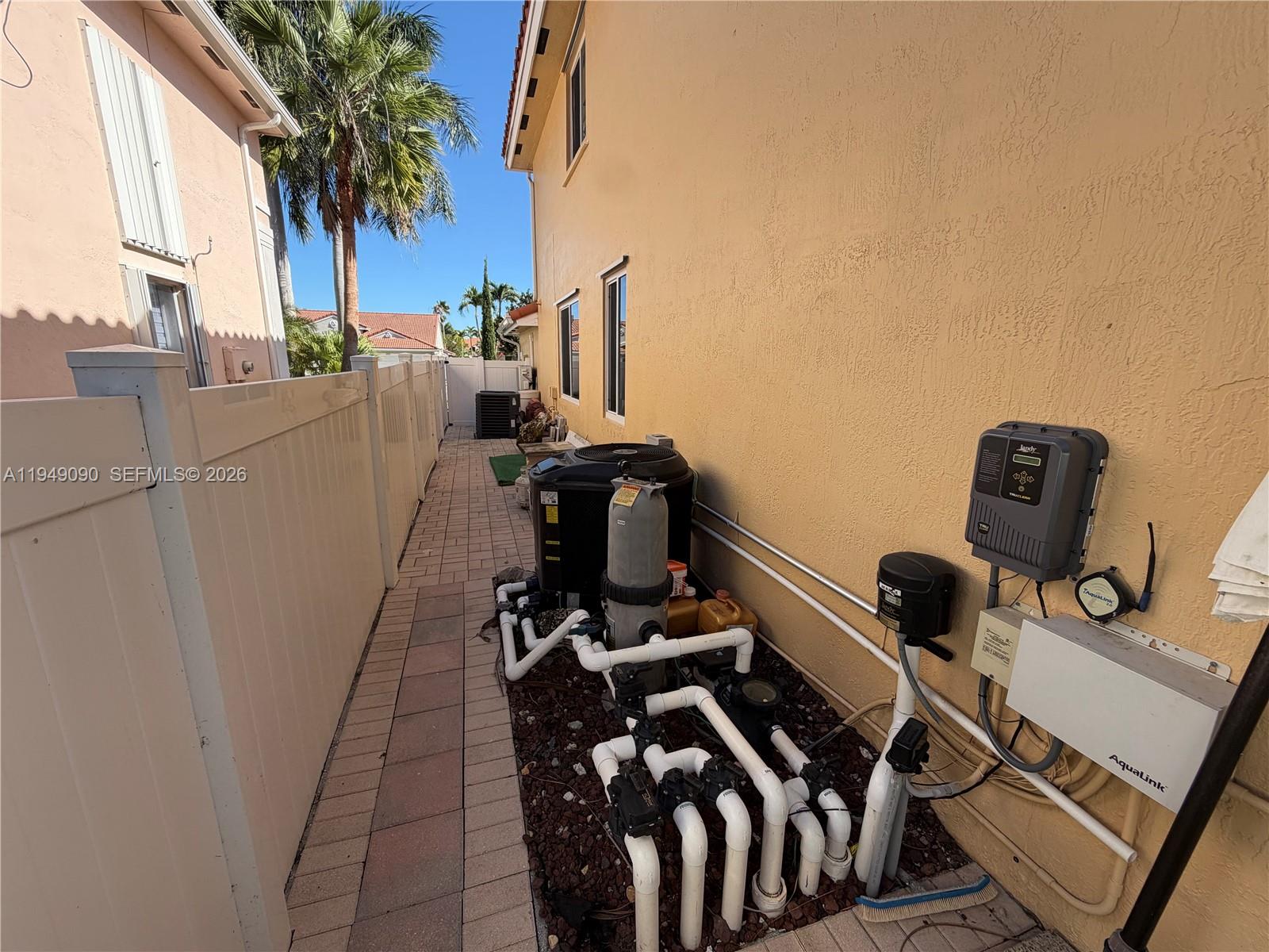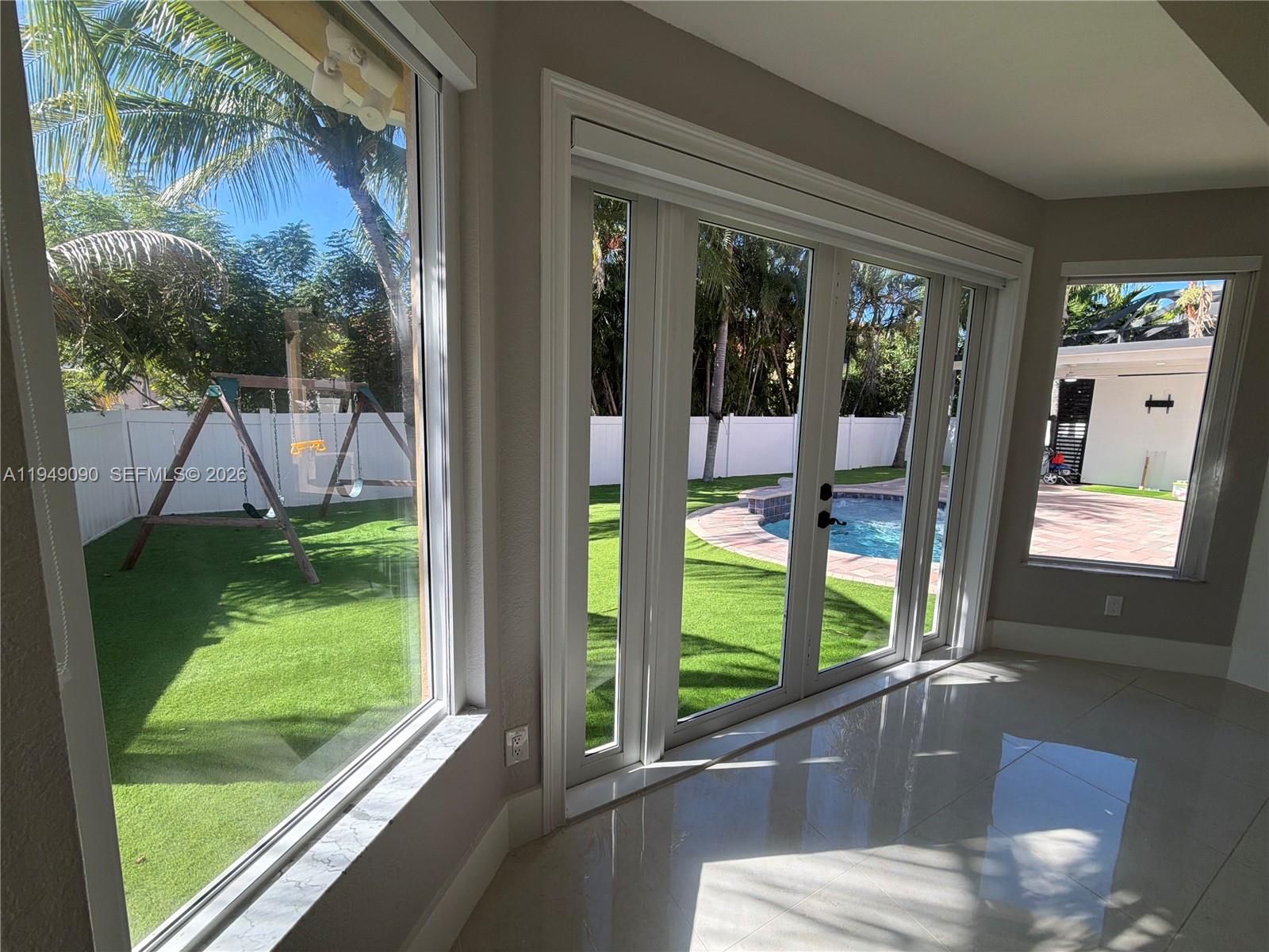 Turn-key, fully renovated home offering extensive upgrades and resort-style outdoor living. This meticulously updated property features a new roof installed in 2018, impact windows, an expanded paved driveway with six-car capacity, generator-ready power hookup, tankless water heater, soft water system, and white PVC fencing for privacy and durability. The interior showcases a beautifully redesigned kitchen completed in 2023 with professional-grade appliances, upgraded shaker cabinetry, and premium accessories. Year-round comfort is provided by a new five-ton A/C system for the main living areas and a dedicated three-ton A/C unit for the master suite, both controlled by Nest smart thermostats. Additional interior upgrades include all-new recessed lighting, modern linear air vents, and fully renovated bathrooms. The two-car garage is equipped with a split A/C unit and ceiling fans for added functionality. The backyard has been transformed into a private oasis featuring a pool and spa with heater, saltwater system, LED color-changing lights, and digital controls. The paved pool deck is complemented by low-maintenance artificial grass, a new sprinkler timer installed in 2025, and a palm tree privacy line with accent landscape lighting. A brand-new covered porch completed in 2025 includes lighting, ceiling fans, TV-ready setup, and power outlets—ideal for entertaining or relaxing. Lawn and pool maintenance are included, making this home truly move-in ready.