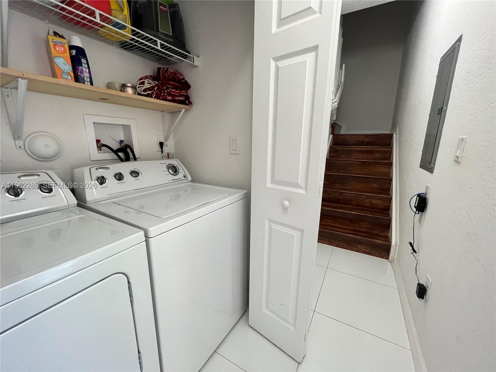 Perfect location in gated community. Beautiful modern apartment with white tile and wood stairs, 2 master bedrooms with private bathrooms and walking closets and the second floor. Large kitchen with stainless steel appliances, granite counter tops. Full size washer/dryer. 2 assigned parking spaces, accordion shutters, beautiful kept community with pool and green area to walk. Close to FIU, International and Dolfphin Malls and Airport.