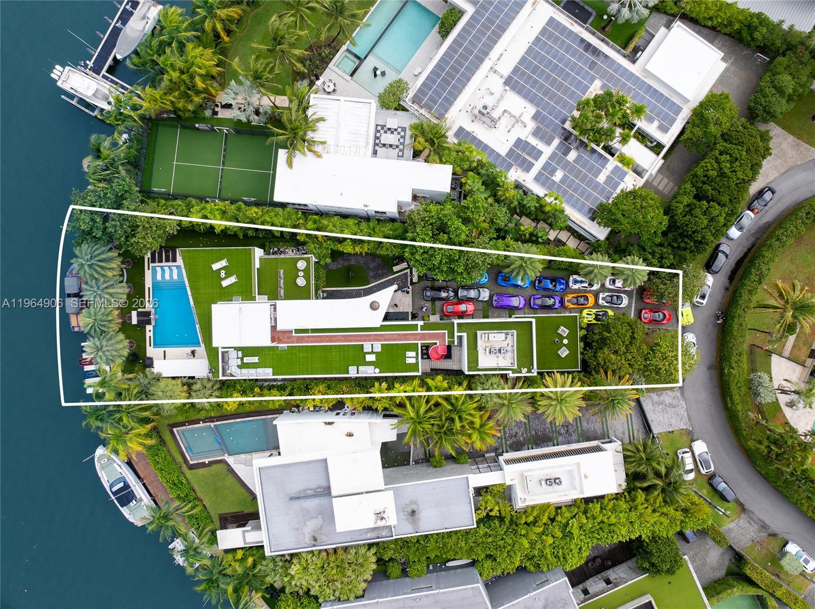 This striking modern tri-level waterfront residence blends bold architecture with refined luxury. Set on a 17,676 SF gated lot w/approx. 90FT of WF, the home offers 9,424 total SF with 5BR/7.5BA, expansive family, dining, & living areas all with water views. Highlights include marble & rich hardwood floors, custom millwork, chef’s kitchen with Wolf and Miele appliances, built-in aquarium, & seamless indoor-outdoor flow. Principal suite features an expansive terrace, spa-style bath, and massive walk-in closet. Additional amenities include a rooftop lounge with firepit & TV, a gym-converted garage, state-of-the-art theater, resort-style pool w/waterfall, summer kitchen, custom bar, 45FT dock, 3 jet ski slips & direct Intracoastal access. This residence epitomizes the Miami lifestyle.