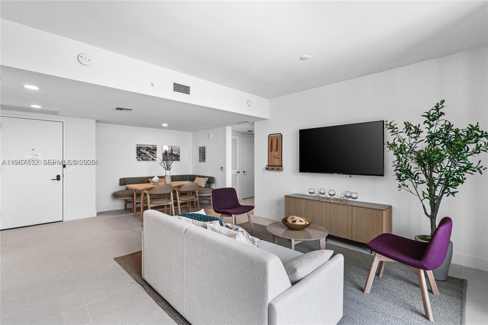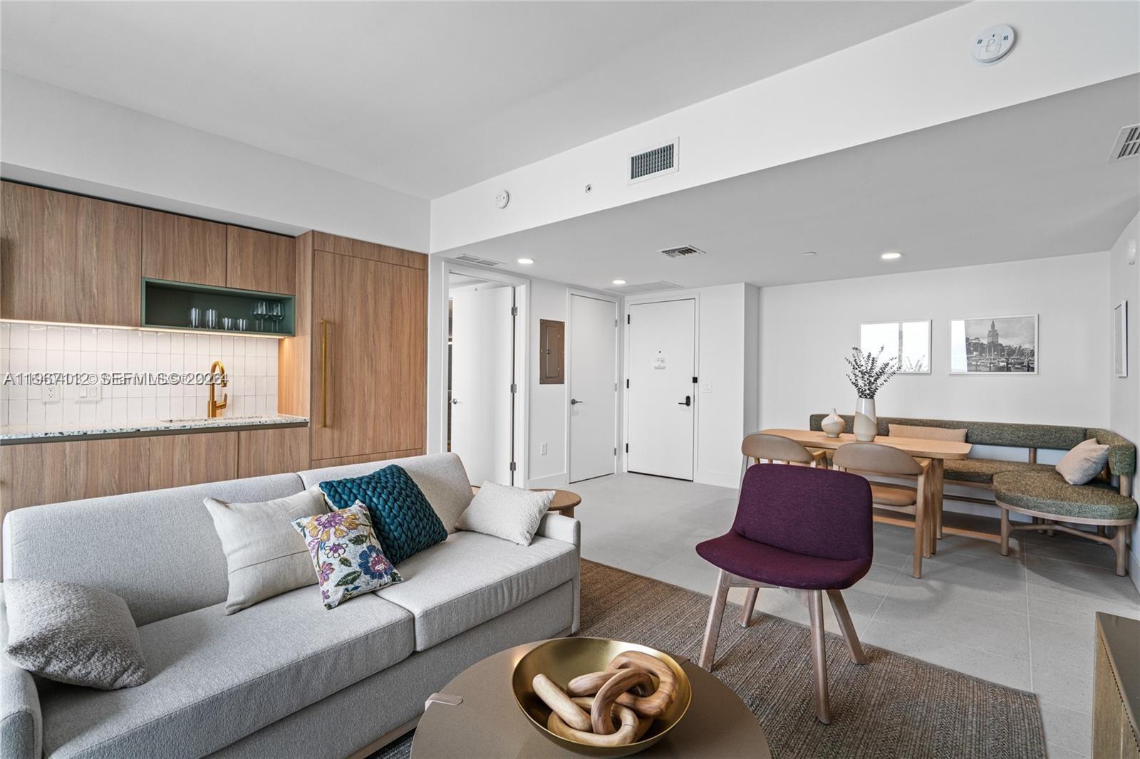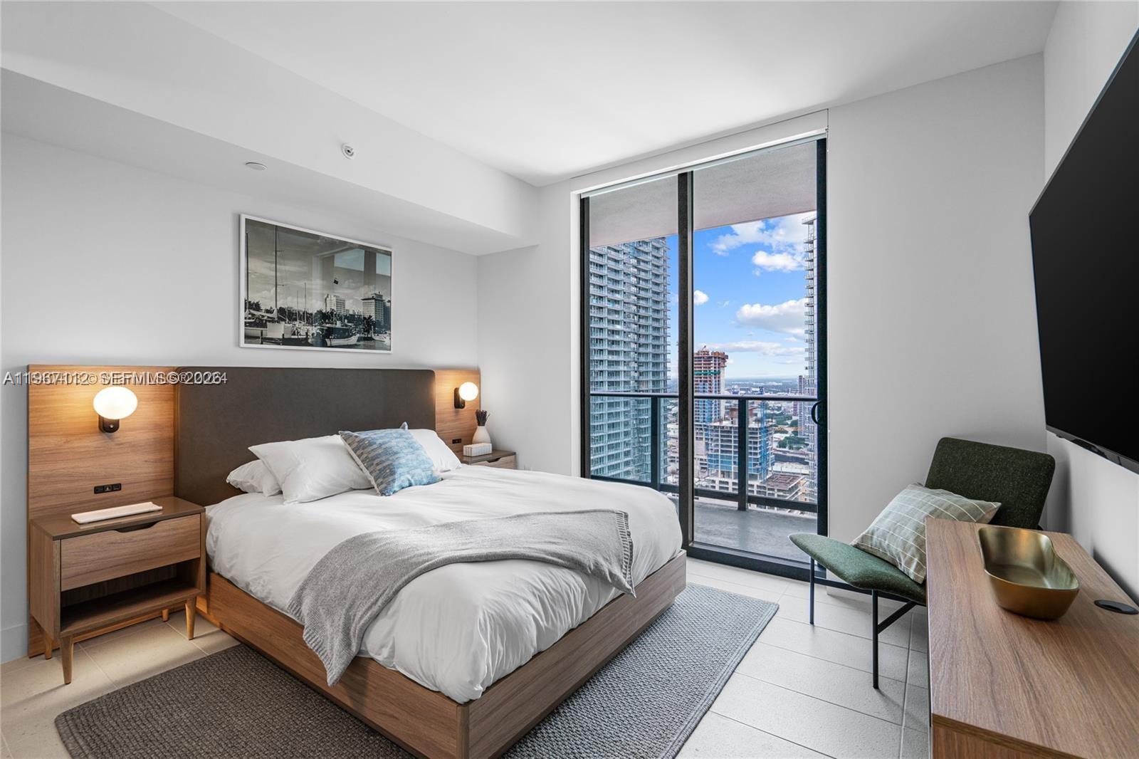 Natiivo/Gale Residences presents a brand new, spectacular 2-bedroom unit featuring a north-facing balcony. This fully furnished residence boasts an equipped kitchen and a TV in every room, designed with elegant West Elm furnishings. Amenities include a swimming pool with a bar overlooking Biscayne Bay, a steak restaurant, a speakeasy bar, a hammam, spa/sauna facilities, steam treatment rooms, a business center, a party room, and a gym with stunning views of Biscayne Bay. Enjoy 24-hour concierge and valet parking services. Conveniently located just one block from Bayside and the Miami World Center, you'll find shopping and dining options nearby. The Brightline train station, connecting to Orlando, is only a few blocks away. One Valet Parking included.