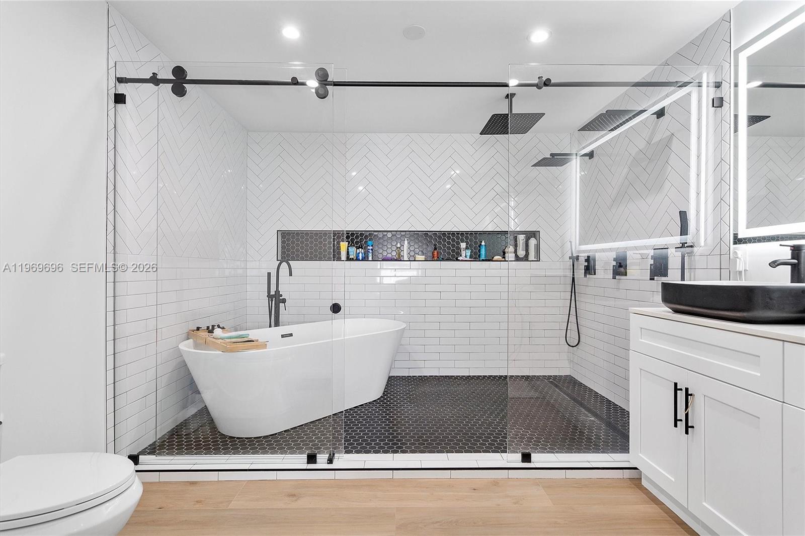 Stunning 2,188 sqft of fully renovated luxury living! Home is a 4/3 + an office and features include impact windows/doors, built-in speakers throughout, porcelain wood-look tile, custom kitchen with quartz waterfall island, black finishes, soft-close cabinets, and stainless-steel appliances. Bathrooms offer LED mirrors, vessel sinks, and frameless glass showers. Spacious primary suite with custom walk-in closet and spa-style bath featuring soaking tub and rainfall shower. Amazing backyard includes a heated pool equipped with LED lights and a covered patio. Indoor laundry room with new washer & dryer, smart lighting, security system, blackout shades, and many other amenities storage. Pets welcome! Available May 1, 2026