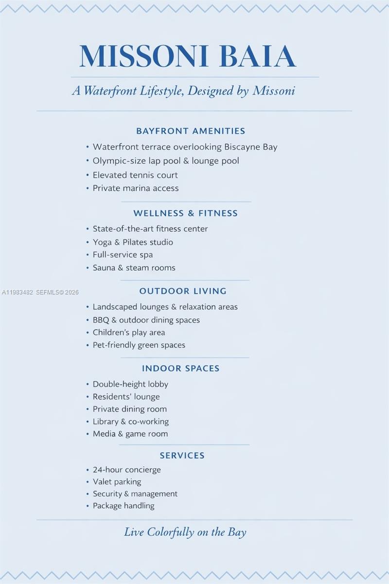 Welcome to one of the most rare and sought-after Bayfront residences at Missoni Baia, offering an exceptional opportunity to live in a premier unit in this iconic Edgewater tower. This stunning corner home spans over 1,900 square feet of interior and exterior space. Showcases unobstructed, panoramic views of Biscayne Bay, with breathtaking water vistas from nearly every room. Wake up in your private suite to direct bay views and step out onto your expansive terrace to take in the vibrant waterfront where boats pass by and marine life can often be seen right below. Floor-to-ceiling windows flood the residence with natural light, creating a seamless connection between indoor and outdoor living. Designed with sophistication in mind, the residence features elegant marble floors throughout, custom European cabinetry, and top-of-the-line SubZero and Wolf appliances. A private elevator foyer entry adds an extra level of exclusivity, while the deep terrace offers the perfect setting for entertaining or simply enjoying the view. Missoni Baia offers over 30,000 square feet of world-class amenities, including an Olympic-length lap pool, tennis courts, state-of-the-art fitness center, spa, theater, children’s and teen lounges, pet spa, beauty salon, and outdoor BBQ areas.