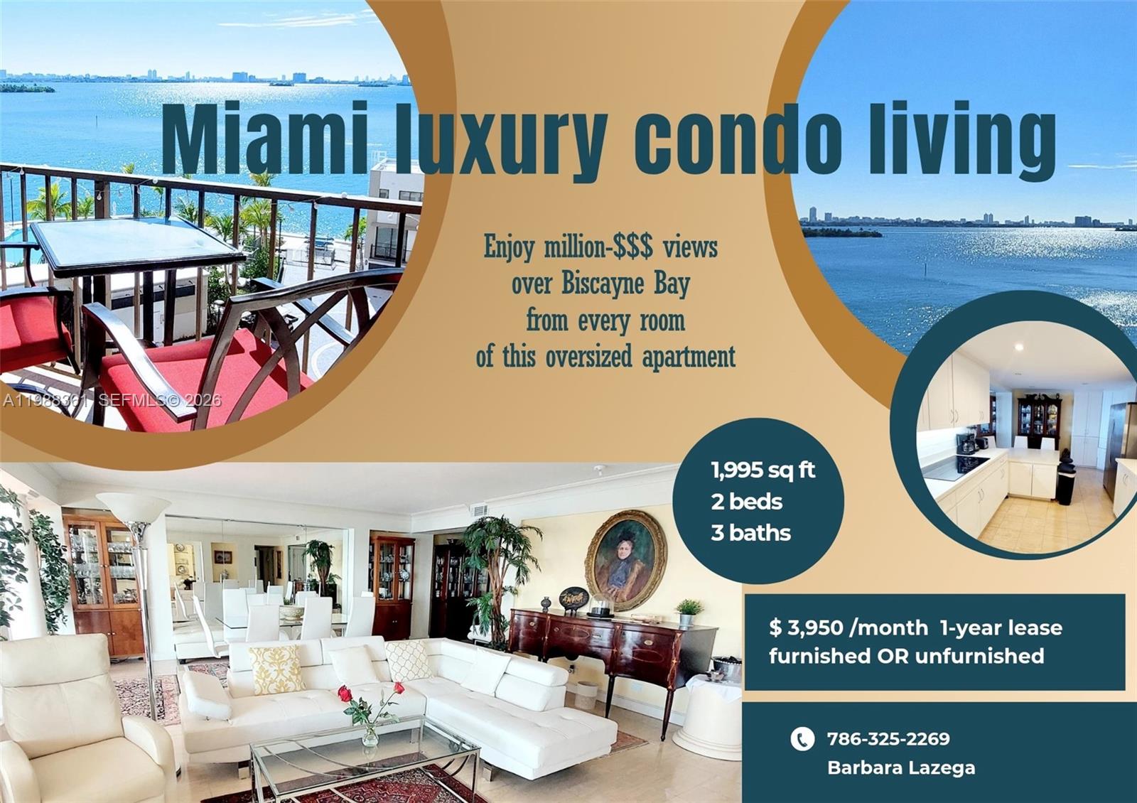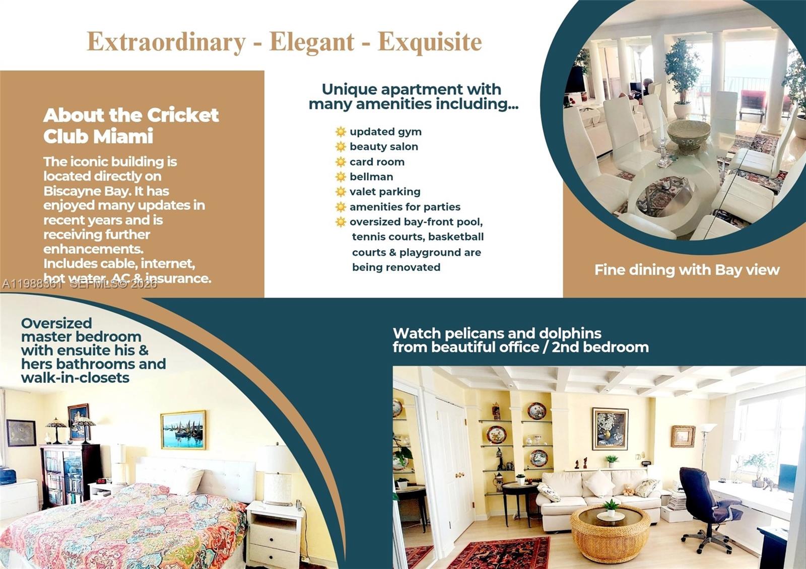 Miami Luxury Living with millon-dolllar views overlooking Biscayne Bay from every room.This elegant over-sized 1950 sq ft apartment offers 2 bedrooms and three bathrooms in a much-desired line of the iconic Cricket Club.It boasts panoramic views of the bay and Miami Beach skyline.Kitchen with quartz countertops,master bedroom with ensuite his and her bathrooms and walk in closets,oversized rooms,marble floor living room.The 2 nd bedroom currently used as office/sitting room features unique woodwork and glass shelves.,Miami Luxury building features updated gym,bellman,valet parking,beauty salon,card room.Pool and tennis courts are currently under construction. "Unit can be leased (part-) furnished or unfurnished".Seasonal rental at an increased rate available.EASY TO​​‌​​​​‌​‌​​​​‌‌​‌​​​​‌‌​​‌‌​​‌‌ SHOW"