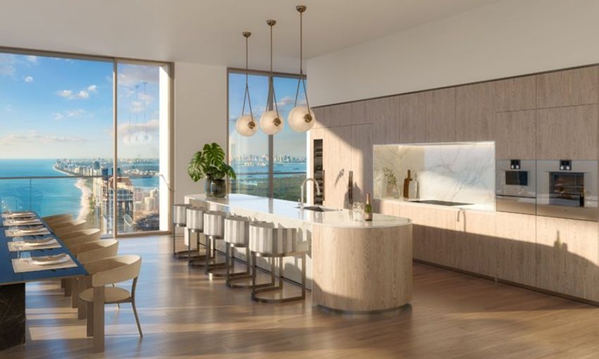 Las alturas de los techos van de 10 a 12 pies en los penthouses, y todas las residencias están diseñadas con vistas panorámicas al océano. Además, todas cuentan con acabados de diseñador y equipamiento completo, incluyendo electrodomésticos de calidad alemana Miele y tecnología de hogar inteligente.